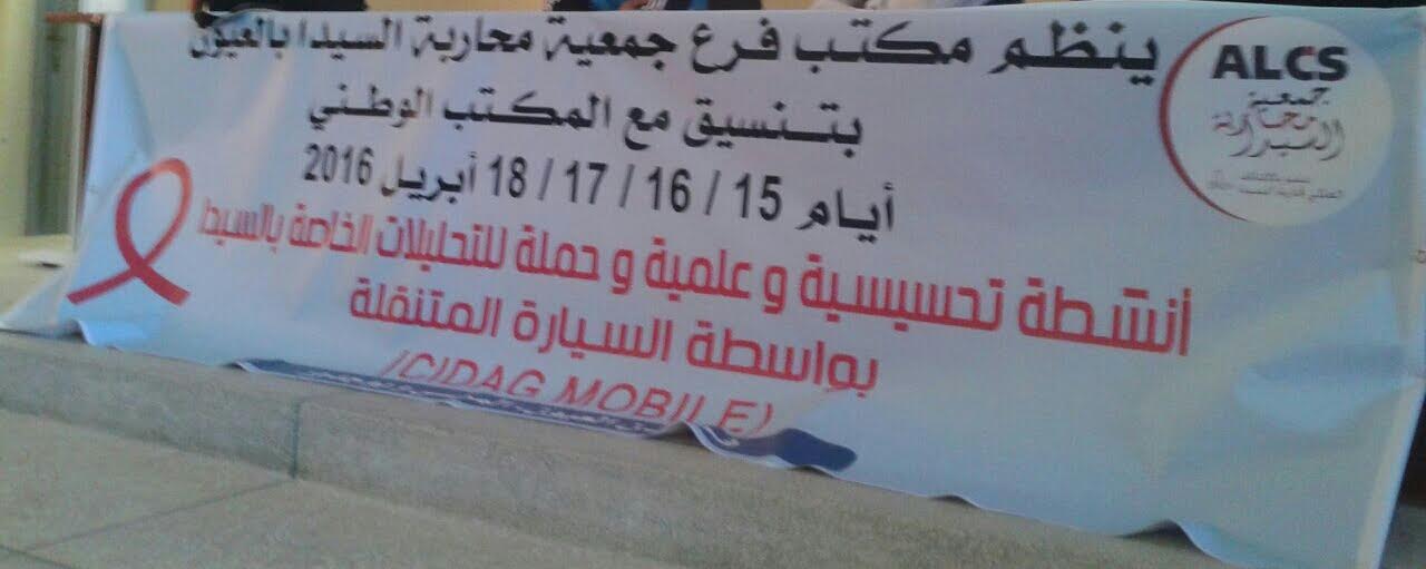 نظم فرع جمعية محاربة السيدا بالعيون بتنسيق مع المكتب الوطني للجمعية انشطة تحسيسية و علمية و حملة للتحليلات الخاصة بالسيدا أيام 15 / 16 / 17 /18 أبريل 2016 في مدن العيون، المرسة و بوجدور