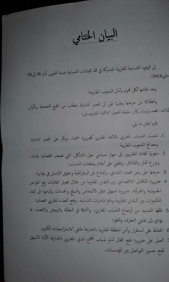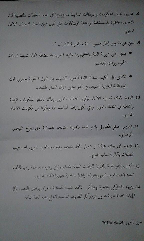 اختتمت اشغال قمة القيادات الشبابية بمدينة العيون، والتي دامت 3 أيام من الندوات و المشاورات والنقاشات الحادة أحيانا ، لتتبلور كل هذه الأفكار في بيان ختامي تعاهدت كل الوفود على العمل على تطبيقه على أرض الواقع .