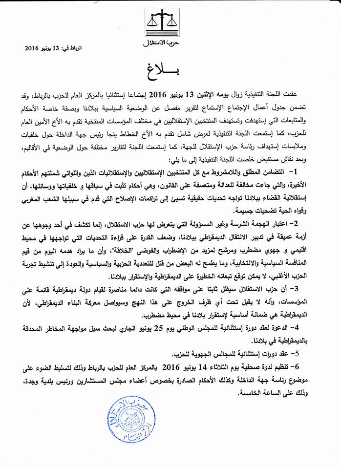 بلاغ اللجنة التنفيذية لحزب الاستقلال