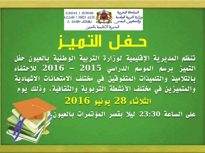تنظم المديرية الإقليمية لوزارة التربية الوطنية بالعيون حفل التميز برسم الموسم الدراسي 2015 – 2016 للاحتفاء بالتلاميذ والتلميذات المتفوقين في مختلف الامتحانات الاشهادية والمتميزين في مختلف الأنشطة التربوية والثقافية، وذلك يوم الثلاثاء 28 يونيو 2016، على الساعة 23:30 ليلا بقصر المؤتمرات بالعيون.