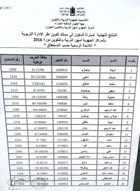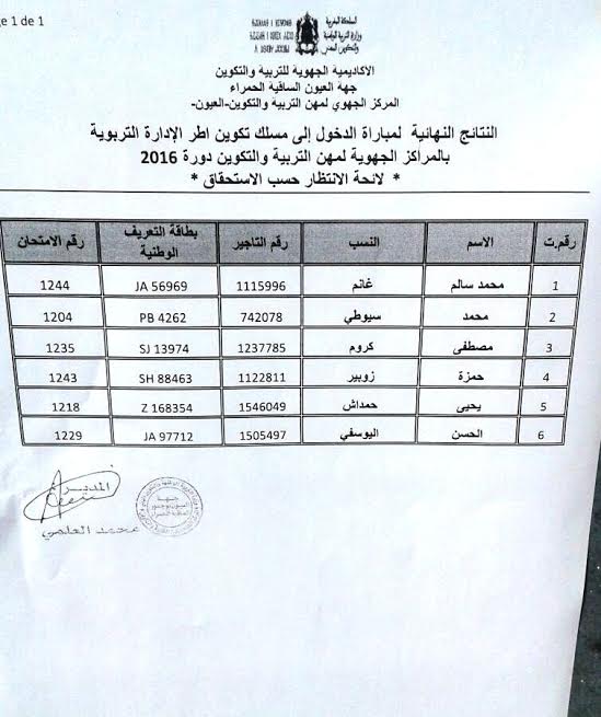 النتائج النهائية لمباراة الدخول الى مسلك تكوين اطر الادارة التربوية بالمركز الجهوي لمهن التربية والتكوين بالعيون دورة2016.