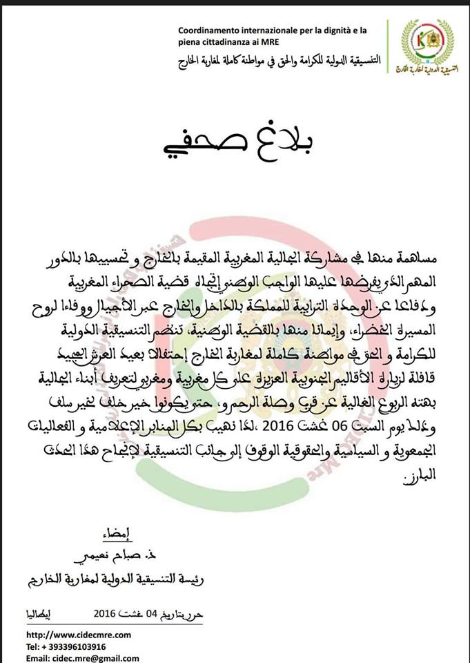 التنسيقية الدولية للكرامة والحق في المواطنة كاملة لمغاربة الخارج تصدر بيان صحفيالمجتمع المدني إدارة الموقع نشر في 4 أغسطس 2016 الساعة 8 و 38 دقيقة الصحراء لايف : ايطاليا مشاركة بفايسبوكFacebookFacebookمشاركة بتويترTwitterTwitter مشاركة بواتسابWhatsAppWhatsApp Share to ارسال ايميلEmailEmail مشاركة بلينكدانLinkedInLinkedInمشاركة بمسنجرMessengerMessenger طباعةPrintطباعة رابط المشاركة :