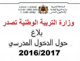 تنهي وزارة التربية الوطنية والتكوين المهني إلى علم الرأي العام الوطني والتعليمي أن الانطلاقة الفعلية للدراسة بكافة المؤسسات التعليمية برسم الموسم الدراسي 2016-2017 ستكون، كما هو محدد في المقرر الوزاري الخاص بتنظيم السنة الدراسية، يوم الاثنين 19 شتنبر 2016 بالنسبة للأسلاك التعليمية الثلاث ، وذلك تفاديا لحدوث أي ارتباك في الدخول المدرسي الذي يتزامن هذه السنة مع عيد الأضحى المبارك، على أن إرجاء الانطلاق الفعلي للدراسة إلى هذا التاريخ لن يمس عدد أسابيع الدراسة المحدد في ذات المقرر، وبالتالي فلن يكون له أي تأثير سلبي على استكمال المقررات الدراسية.