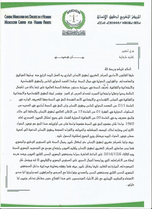 قام وفد من المركز المغربي لحقوق الانسان قبل أيام ، بزيارة لعدد من المؤسسات التابعة لوزارة الصحة بمدينة العيون ، و على إثرها أصدر بيان توصل الموقع بنسخة منه .