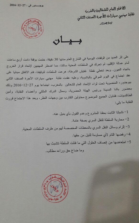 توصل الموقع ببيان صادر عن الاتحاد العام للشغالين بالمغرب ، نقابة مهنيي سيارات الاجرة الصنف الثاني ببوجدور ، يبرز من خلاله سلسلة النضالات التي سطرها منتسبي النقابة من أجل الحصول على مطالبهم ، كان أخرها بالامس عندما حاول مهنيي سياراة الاجرة ، القيام بمسيرة بالسيارات الى مقر ولاية جهة العيون الساقية الحمراء ، ليتم الاتفاق بعدها عن العدول عن هذه الخطوة في مقابل فتح باب النقاش وهو ما تم بالفعل اليوم في اللقاء الذي جمعهم مع ممثل السلطة المحلية لمدينة بوجدور باشا الاقليم وعدد من المتدخلين ، و في ختام هذا اللقاء أصدر مكتب النقابة البيان التالي :