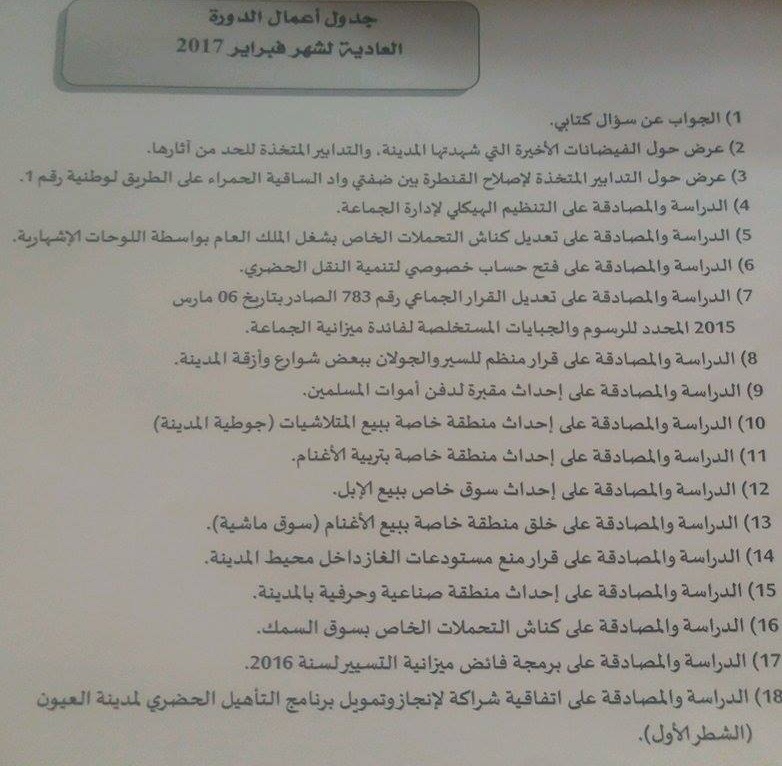 عرفت صباح اليوم قاعة الاجتماعات بالمجلس الجماعي للعيون انعقاد أشغال دورة فبراير 2017 العادية ، وقد يتضمن جدول الأعمال عدد كبير من النقط وصلت الى 18 نقطة هي على الشكل التالي :
