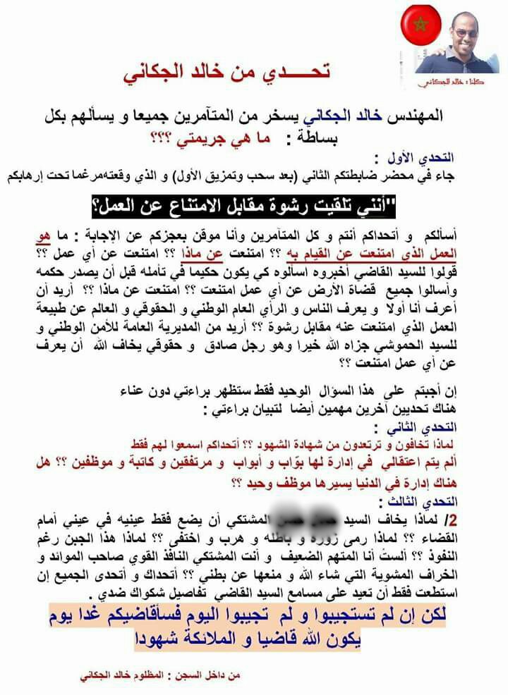 رسالة للمهندس خالد الجكاني من داخل السجن قد تغير مجرى القضية برمتهامقالات الرأي إدارة الموقع نشر في 19 فبراير 2017 الساعة 12 و 40 دقيقة الصحراء لايف : سعد بوه مشاركة بفايسبوكFacebookFacebookمشاركة بتويترTwitterTwitter مشاركة بواتسابWhatsAppWhatsApp Share to ارسال ايميلEmailEmail مشاركة بلينكدانLinkedInLinkedInمشاركة بمسنجرMessengerMessenger طباعةPrintطباعة رابط المشاركة :