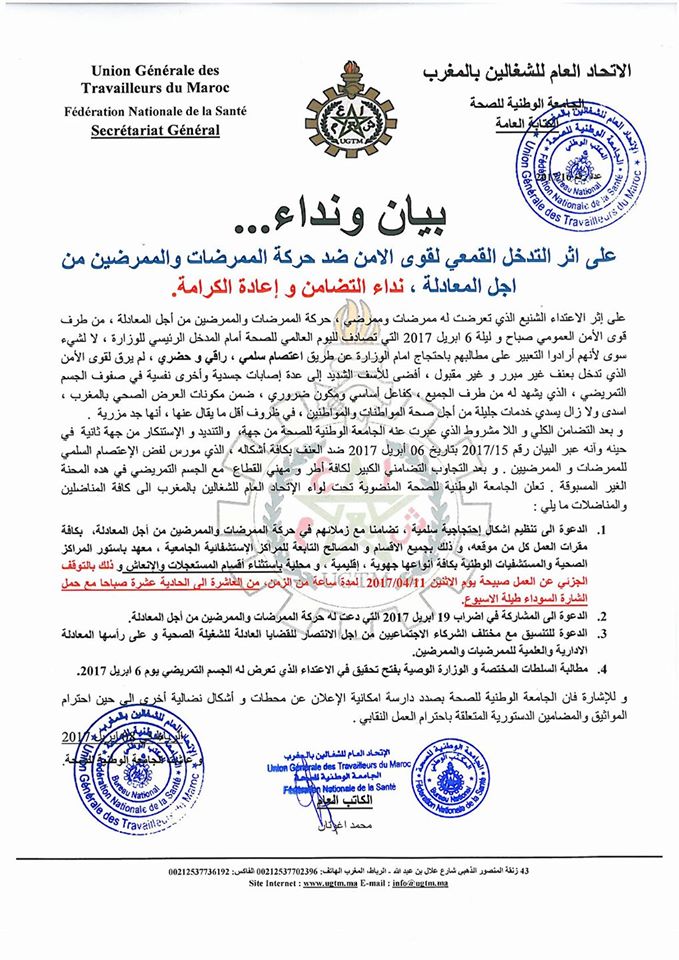 الاتحاد العام للشغالين بالمغرب يصدر بيان شديد اللهجة بعد التدخل القمعي ضد الممرضينمنوعات إدارة الموقع نشر في 9 أبريل 2017 الساعة 1 و 19 دقيقة الصحراء لايف : سعد بوه مشاركة بفايسبوكFacebookFacebookمشاركة بتويترTwitterTwitter مشاركة بواتسابWhatsAppWhatsApp Share to ارسال ايميلEmailEmail مشاركة بلينكدانLinkedInLinkedInمشاركة بمسنجرMessengerMessenger طباعةPrintطباعة رابط المشاركة :