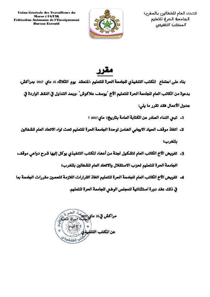 بعد نداء الحكمة الذي وجهه الكاتب العام للجامعة الحرة للتعليم قبل أيام السيد يوسف علاكوش ، اجتماع المكتب التنفيذي بمراكش فقرر بعد التداول و بالإجماع تثمين مضمون نداء الكاتب العام وتجسيده عبر مقرر تنظيمي للمكتب التنفيذي ،وإبقاء اجتماع المكتب التنفيذي مفتوحا مع تفويض صلاحية عقد الهيئة التقريرية للمجلس الوطني للجامعة الحرة للتعليم لدورة استثنائية .