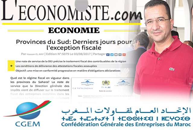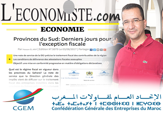 كتبت صحيفة “le conomiste” في عددها الصادر يوم الخميس 3 غشت 2017 مقالا مطولا تحت عنوان ” الأقاليم الجنوبية .. أخر أيام الإعفاء الضريبي ” وذلك في اطار تحليل المذكرة الصادرة من طرف المديرية العامة للضرائب في 28 يوليوز 2017 بخصوص الوضعية الجبائية بالأقاليم الجنوبية .