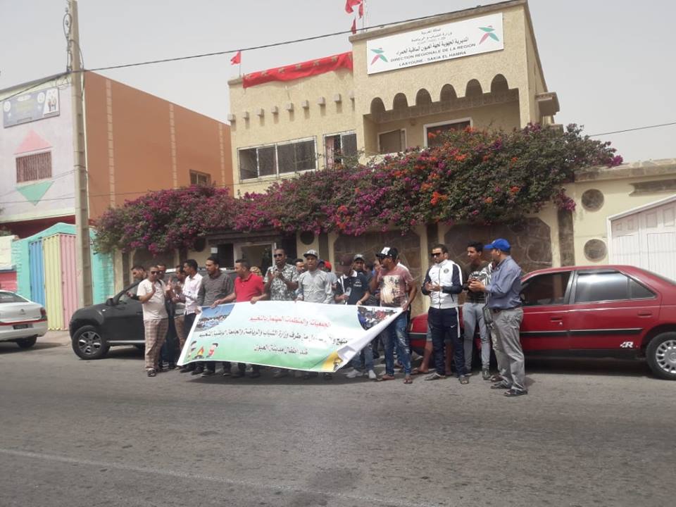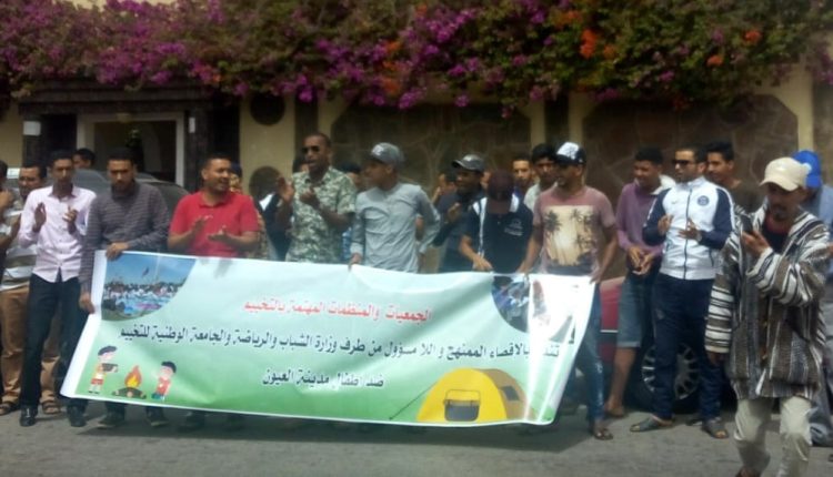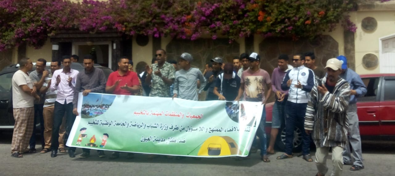 نظمت مجموعة من الجمعيات والفعاليات المهتمة بالتخييم بالعيون وقفة احتجاجية امام المديرية الجهوية لقطاع الشباب والرياضة صباح الْيَوْمَ الخميس ، ونددت من خلالها ما إعتبرته غياب اَي تفهم او دعم لطفولة الإقليم التي حرمت من فضاءات الوزارة .