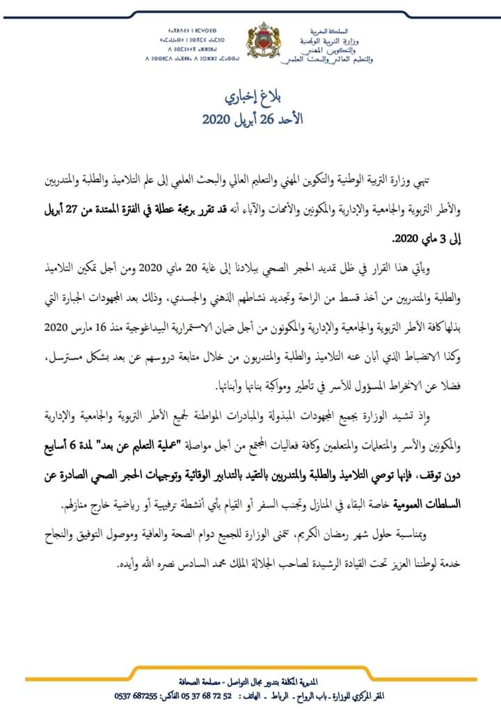 وزارة التربية الوطنية تحدد تاريخ العطلة الربيعيةأخبار وطنية إدارة الموقع نشر في 27 أبريل 2020 الساعة 1 و 41 دقيقة الصحراء لايف : بلاغ مشاركة بفايسبوكFacebookFacebookمشاركة بتويترTwitterTwitter مشاركة بواتسابWhatsAppWhatsApp Share to ارسال ايميلEmailEmail مشاركة بلينكدانLinkedInLinkedInمشاركة بمسنجرMessengerMessenger طباعةPrintطباعة رابط المشاركة :