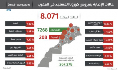 وأوضح منسق المركز الوطني لعمليات طوارئ الصحة العامة بوزارة الصحة، السيد معاد لمرابط، في تصريح بثته وكالة المغرب العربي للأنباء مباشرة على قناتها “M24″، وإذاعتها “ريم راديو”، أن الحصيلة الجديدة رفعت العدد الإجمالي لحالات الإصابة بالمملكة إلى 8071 حالة منذ الإعلان عن أول حالة في 2 مارس الماضي، أي بنسبة 22,2 لكل 100 ألف نسمة، ومجموع حالات الشفاء التام إلى 7268 حالة، أي بمعدل 90,1 في المائة.