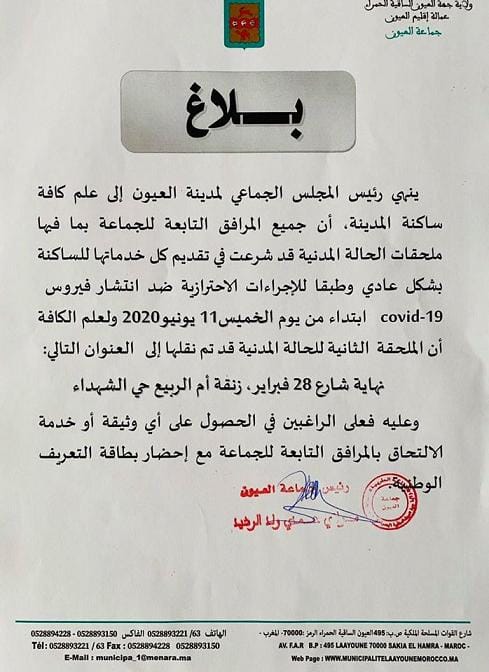 مصالح جماعة العيون تعود للعمل وقد تم تنقيل الملحقة الثانية للحالة المدنية لهذا العنوانأخبار الصحراء إدارة الموقع نشر في 11 يونيو 2020 الساعة 10 و 39 دقيقة الصحراء لايف : العيون مشاركة بفايسبوكFacebookFacebookمشاركة بتويترTwitterTwitter مشاركة بواتسابWhatsAppWhatsApp Share to ارسال ايميلEmailEmail مشاركة بلينكدانLinkedInLinkedInمشاركة بمسنجرMessengerMessenger طباعةPrintطباعة رابط المشاركة :