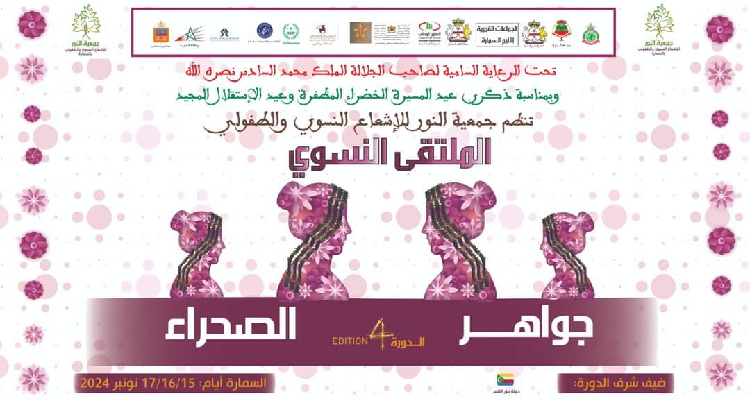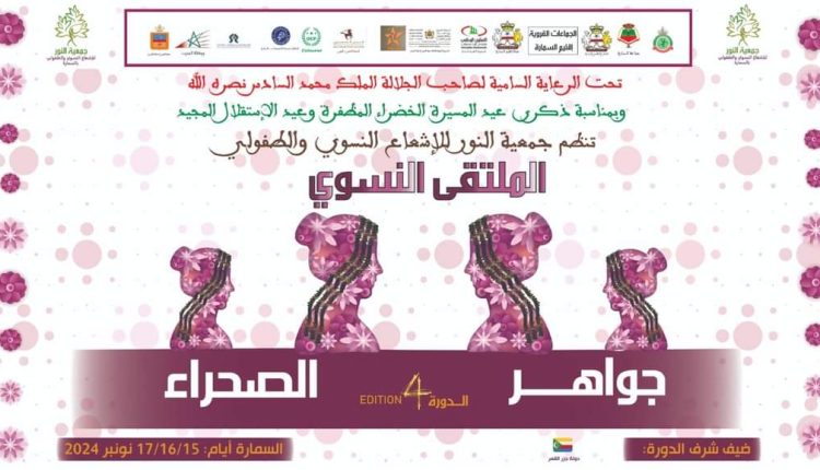 تستعد مدينة السمارة في الفترة من 15 إلى 17 نونبر الجاري، لاحتضان النسخة الرابعة من الملتقى النسوي “جواهر الصحراء”، الذي تشرف على تنظيمه جمعية النور للإشعاع النسوي و الطفولي.