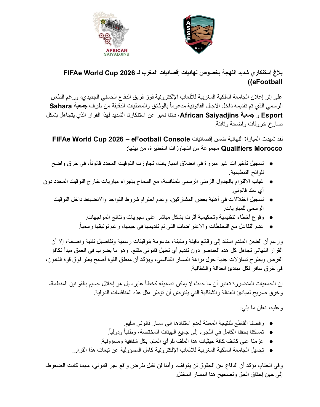 أثار بلاغ استنكاري صادر عن جمعيتي Sahara Esport وAfrican Saiyadjins موجة من الجدل في أوساط الرياضات الإلكترونية بالمغرب، وذلك على خلفية نتائج نهائيات الإقصائيات الوطنية المؤهلة إلى FIFAe World Cup 2026 ، وعبرت الهيئتان عن رفضهما لما وصفته بـ”تجاهل طعن قانوني” تم تقديمه داخل الآجال، مدعومًا بوثائق ومعطيات دقيقة، عقب إعلان فوز فريق الدفاع الحسني الجديدي.